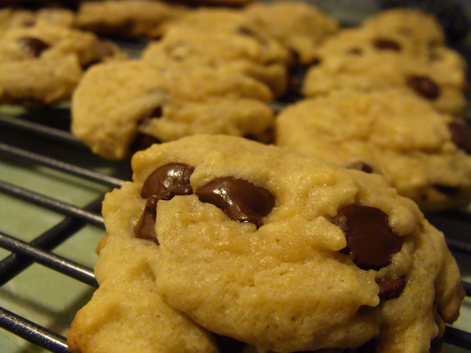 I tried two recipes, one low-fat cookie and one cookie beefed up with butter and shortening. Ya know, just for comparison. ;) I’d have to say that the low-fat cookie (just like on Throwdown with Bobby Flay – who I wish I could meet in person, by the way – we’ll call this one Cookie A) was fantastic straight from the oven! The chocolate melted and the inside was all warm and gooey. It really hit the spot and I was impressed.