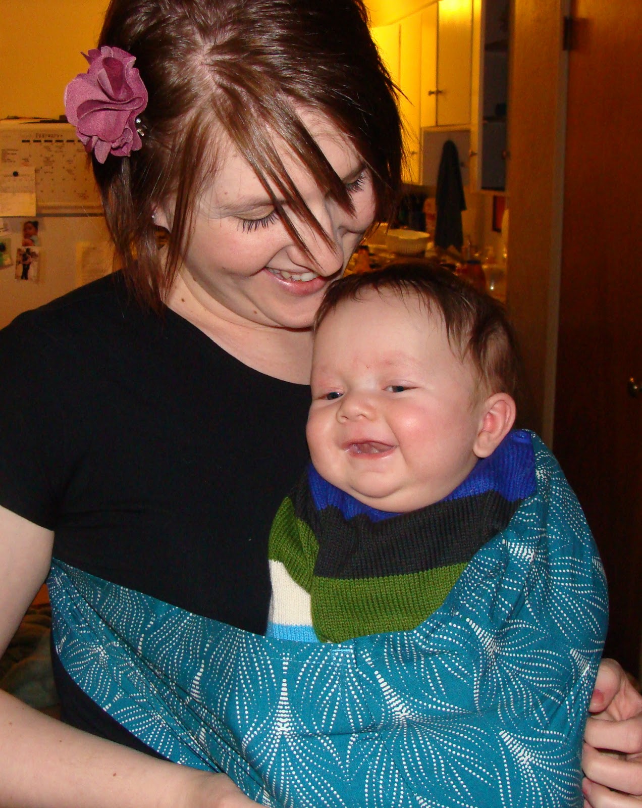 On another note, he seems to tolerate/(sometimes) adore the new sling. Here he is giggling in it: