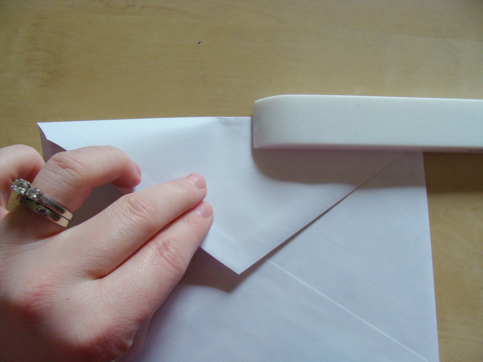 5 Unfold the flap and glue just the top triangle of your paper to the envelope flap.