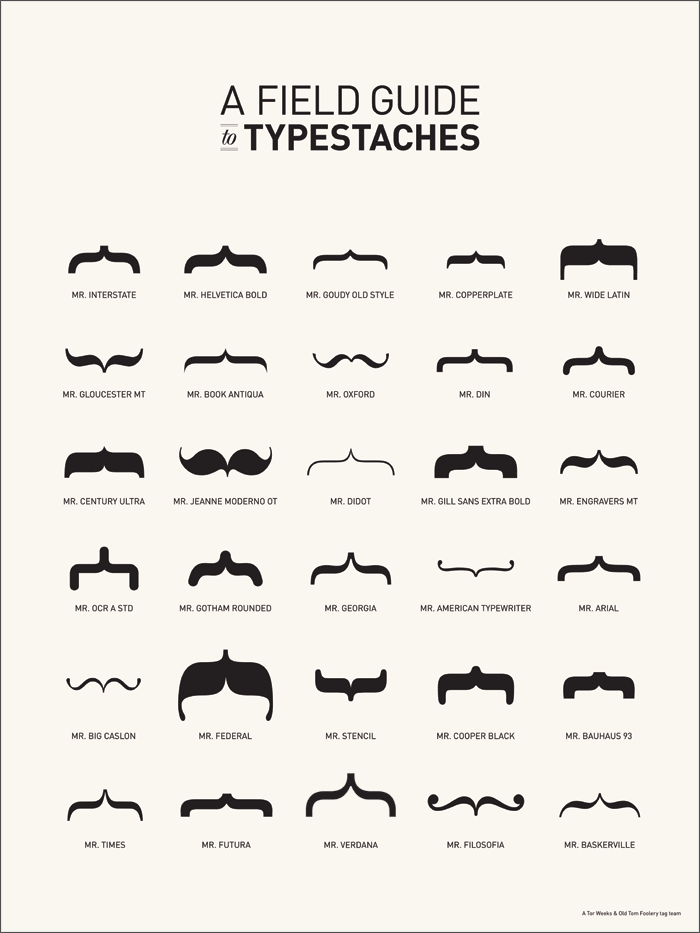 Here’s A Field Guide to Typestaches to celebrate the weekend! You know how I love typography. (Scroll below for a funny story about that.) I think my favorite is Mr. Wide Latin in the upper right corner. I can picture him with large, aviator sunglasses and a plaid shirt.